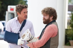 Robert Downey, Jr. as an obsessive-compulsive asshole sparring with Zach Galifianakis as Zach Galifianakis promises all sorts of transgressive fun, and Todd Phillips (The Hangover), the meister of low-down dude comedy, would seem the perfect catalyst, but one can only take so many jokes involving corrupt Mexican law enforcers, marijuana dependency, and child abuse before one wonders why all this envelope-pushing is at the service of such a generic story. Peter (Downey), a frazzled architect anxious to get back to L.A. to attend the birth of his first child, and Ethan (Galifianakis), a wannabe sitcom actor and good-natured simpleton, both get kicked off a flight out of Atlanta when the latter provokes the former with the help of a French bulldog. Forced to make the trip West by rental car, the pair invariably end up at each other’s throats, though Ethan’s throat is a more frequent object of wringing owing to Peter’s acute anger issues. What really cracks Phillips up is America’s preternaturally rude service industry employees (except dope dealers), especially when they’re in wheelchairs. (photo: Warner Bros. Entertainment)