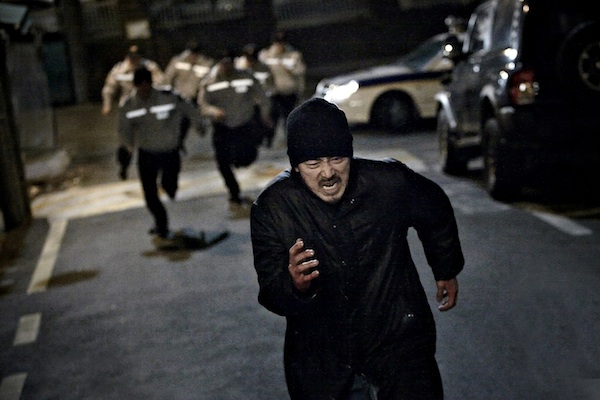 Fans of the Korean Wave are waiting for the next big director to emerge, or for one of the filmmakers from the first Korean Wave to make a creditable comeback. Some of these people say the wait is over, and that Na Hong-jin, whose first feature The Chaser recalibrated the action prerogatives not just of Korean movies, but all of Asia’s. The film’s critical and commercial success convinced Twentieth Century Fox to back his next feature, and he did exactly what was expected of him with The Yellow Sea, which takes all the pertinent qualities of The Chaser and pushes them even further into your face: the breakneck speed, the convoluted plot, the seedy atmosphere, and, most important, the totally unsympathetic characters. Here we have Gu-nam (Ha Jung-woo), an ethnic Korean taxi driver living in Yangji, an autonomous Chinese city on the North Korean border. Gu-nam is already in debt for the money his wife borrowed to get to Seoul, where she went to work illegally. Gu-nam hasn’t heard from her in weeks, and in her absence he’s run the debt up further with his gambling. The mob goons who come to collect point him toward their boss, Myun (Kim Yoon-seok), who makes him an offer he can’t refuse: go to Seoul and carry out a contract hit and the debt gets cleared. Gu-nam makes the journey in the filthy hold of a ship over the titular body of water with other illegals. Once in the capital he stakes out the mark, who turns out to be a university professor, and plans the hit; all the while looking for his wife, whom he imagines in the arms of another man. On the day he sets for the assassination, however, somebody beats him to it, but the police start chasing Gu-nam, and from that point to the end of the movie he doesn’t stop running. Though Gu-nam starts out as the patsy hung out to dry, he ends up being the unwitting catalyst of a gang war between the thugs attached to a local transportation magnate (Cho Seong-ha) and Myun’s imported army. But there’s a lot more, and at times you need a flow chart to track the various strands of double and triple crosses, not to mention the convergence of Gu-nam’s search for his wife and discovery of the person who ordered the initial assassination. Meanwhile, you have to sit through fight scenes that are so chaotic they seem to tumble right off the screen, and in the Korean Wave tradition they’re bloodier than the ones in the last Korean thriller you saw. Only one gun is used, by a callow policeman. Everyone else gets by with knives, axes, even large dog bones. That blood sure ain’t yellow, but it’s enough to fill a sea. (photo: Wellmade Starm and Popcorn Film)