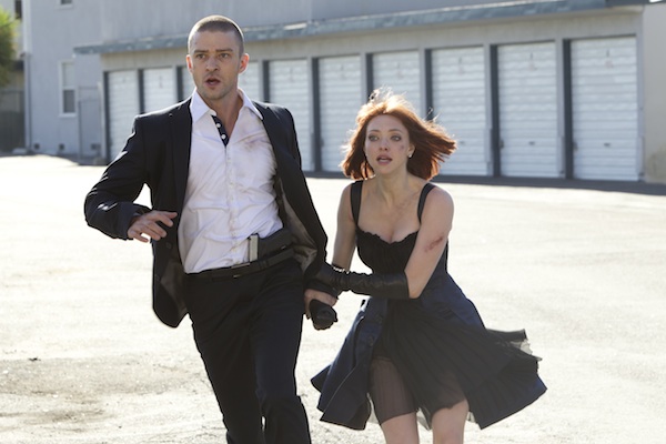 Andrew Niccol is Hollywood’s most imaginative creator of dystopian futures, and In Time may be his cleverest gimmick yet. As with Gattaca, the theme is eugenics, though the economics are more pronounced and determinative. Humans are genetically programmed to stop aging at 25, after which they live only as long as the time they have “earned,” the way we normally think capital is earned. Niccol translates this tricky concept in a neat way. Every person has a time code on his/her arm that indicates how much time is left before extinction. The time code goes down when a “payment” is debited and goes up with payment credited. The upshot is crystal clear: the rich live longer than the poor. Justin Timberlake plays Will, a blue collar drudge who is trying to help his mother (Olivia Wilde, looking like Timberlake’s sister) pay off a debt. When she misses the payment by seconds Will is left bereft and even more of a landlord-hater than you or me. By chance he meets a wealthy guy slumming it in the bad part of town and acquires the guy’s time, much to the consternation of a local hood (Alex Pettyfer) whose M.O. is stealing poor slobs’ time for himself. Will uses his new “fortune” to sneak into the upscale sector where he invites himself to a cocktail party being thrown by a banker (Vincent Kartheiser) for his daughter (Amanda Seyfried), who is typically rebellious. When Will is fingered by a time cop (Cillian Murphy) for the death of the rich guy, he takes the daughter hostage and shows her how the other half lives. Her eyes now opened, she joins him in a string of bank robberies where they liberate “time” for the masses. By this point, the originality of the time-is-money conceit has worn off through familiarity and Niccol has to cruise on pure movie mayhem, which is fortified by his doctrinnaire approach to characters, all of whom are hackneyed types impervious to whatever nuance of feeling the actors try to bring to them. Nevertheless, one aspect never wears off: the youthful appearance of everyone on the screen. Unlike the Bruce Willis vehicle Surrogates, In Time doesn’t try to make the youthfulness seem artificial, so you really do feel disconcerted when Amanda Seyfried calls Vincent Kartheiser, who’s only six years older, “father.” Since there’s no elaborate backstory, the only purpose to this genetic technology is to keep the working classes completely under the thumb of their betters, and that’s a useful idea for as long as the formula lasts, which isn’t very long. Even if the car chases and gun battles were better staged, the fact that they’re here in such abundance proves that the producers think of the revolutionary subtext as nothing more than fantasy fulfillment, which means the audience will, too. (photo: Fox and its related entities)