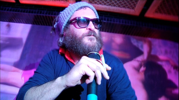 When this mock documentary opened in the U.S. more than a year ago, its subject, Joaquin Phoenix, was more than a year into his “retirement from acting.” At that time, the lengthening time period since Phoenix’s last movie, the romantic drama Two Lovers, was the only indication of the sincerity of Phoenix’s claim, and yet most critics assumed the movie was a hoax, or at least mostly staged. Rapping was the ostensible vocation he was pursuing at the time his brother-in-law, actor Casey Affleck, started filming this descent into humiliation. As Phoenix says in one of the movie’s many rambling, incoherent rants, he’s become so tired of hearing himself described as “emotional, intense, and complicated” that he can’t decide if those attributes are real or the result of hearing them all the time; so whether or not the film is as fraudulent as the “acting career” he purports to despise, it advances the idea that he really does want out, otherwise why even go through the trouble of documenting his meltdown? This seems to be one surefire way of burning your bridges behind you. Where the movie gets difficult to believe and even more difficult to watch is in those moments when Phoenix—bloated, shaggy, glassy-eyed—acts out all the worst stereotypes of the self-deluded Hollywood celebrity: drugs by the handful, prostitutes, pulling star rank for favors, and, worst of all, abusing friends and colleagues. That Affleck occasionally wanders into the frame to give enabling support to this asshole only makes the eyebrows inch further upward, but one has to say, if it’s a performance it’s one of Phoenix’s best. Still, to what end? Though that’s always going to be the main question about this movie, the collateral result is a total revelation of the bogus nature of celebrity. Though no one comes off as badly as Phoenix, the other famous people who appear are diminished simply because they make a living being the same thing Phoenix is so desperate to escape. Sean Combs can barely hide his pain listening to Phoenix’s feeble hip-hop demos because he’s allowed his feeling for a fellow star to rule his decision, and when he asks Phoenix how much money he has to spend on production, he sounds as mercenary as his haters always charged. From James Edward Olmos’s new age lecture to Jamie Foxx’s embarrassing cameo at a Miami night club, the wages of fame turn out to be shit. I’d like to think that was the point Phoenix and Affleck were making. (photo: Flemmy Productions)