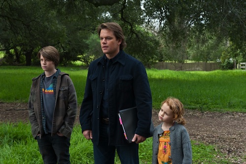 W.C. Fields famously warned fellow entertainers to never work with dogs or children, presumably because they’ll always upstage you but given Fields’ reputation most likely it was because he thought any entertainer worth his weight in ticket stubs probably hated them as much as he did. One wishes Matt Damon, certainly the most appealing male movie star of his generation, had heeded that advice. Damon plays real-life non-fiction writer Benjamin Mee, whose wife dies leaving him to raise his disaffected teenage son, Dylan (Colin Ford), and preternaturally adorable 6-year-old Rosie (Maggie Elizabeth Jones) on his own. Rosie is no problem, but Dylan, a budding artist given to drawing macabre portraits that scare his school principal, is more than a handful so Benjamin seeks a change of scenery. Though he has been downsized the way writers tend to be these days, Benjamin somehow has an inheritance that is never satisfactorily explained and while house-hunting stumbles upon a huge estate in the suburbs of Los Angeles that he immediately falls in love with, even though it’s attached to an honest-to-God private zoo, which, according to some municipal law, must be acquired by the person who buys the property. Naturally, everyone thinks he’s crazy, but as he sees it, “it’s simple destiny,” though if this weren’t based on a real story it would seem more like unimaginative screenwriting, and there is plenty of other stronger evidence to that effect. One waits impatiently for director Cameron Crowe’s script to finally confront something that resembles reality, but the cliches and contrivances continue apace; in fact, they accelerate as Benjamin and family endure all the indiginities of trying to make the zoo into a viable commercial enterprise, starting with winning over the crew of eccentrics who take care of the animals full-time, including a drunken Scotsman (Angus Macfadyen), a kid with a monkey perched permanently on his shoulder (Patrick Fugit), and the grumpy, capable and incredibly hot manager, Kelly (Scarlett Johansson). This team’s doubts about their new boss’s capabilities are allayed once they realize how sincere Benjamin is, and the only thing Crowe has going for him in this luckless enterprise is Damon’s natural ability to convey sincerity. One can’t help but wonder, in fact, what such a conscientious soul like Benjamin is doing in the business of imprisoned wild beasts, but the movie shows less concern for the welfare of the animals than with the state of Benjamin’s paternal resilience. Dylan becomes even moodier despite the humiliating puppy-dog attentions of Kelly’s niece (Elle Fanning), and too much emotional currency is spent on father-and-son coming to terms with their feelings for each other. Fields’ advice needs to be amended: never work with kids and Cameron Crowe, at least not in the same movie. (photo: Twentieth Century Fox)