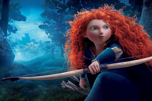 One of the reasons Pixar is the greatest American animation house is its reimagining of the tradition of anthropomorphizing animals and inanimate objects. While it tends to do well with people, too (The Incredibles, Up), it can’t render humans any differently from what they are, except make them look funny; which is why Brave feels like a step back, a retreat into the Disney comfort zone of princesses and long-ago-and-far-away. It means nothing special that the princess in question, a red-haired Scottish lass named Merida (voiced by Kelly McDonald), eschews the demure stereotypes of her station, preferring to ride her white stallion at full speed through the forest, picking off targets with her trusty bow and arrow. Pluck and individuality are practically hard-wired into all Disney heroes, whether male or female. What makes Pixar heroes different is something else, something unique, like Wall-E’s unabashed sentimentality, or Remy’s intuitive use of spices. These aspects aren’t just filagree, they define the characters in new and interesting ways. Merida is defined by what she’s not. She’s not a girl who wants to get married and live happily ever after with her Prince Charming, which is why she bridles at her mother Queen Elinor’s (Emma Thompson) efforts to make her a desirable match for a royal scion. Her father, King Fergus (Billy Connolly), like so many other fictional fathers, doesn’t really care about those things, only that his daughter is happy. But he also wants his wife to be happy, which means he prods Merida down the primrose path to matrimony, and when three clan princes are offered for her choice, she rebels by choosing none of them, enraging her mother and causing chaos in the realm. Fortunately, chaos is something Pixar is quite good at, and the roustabout action, whether it’s the naughty mischief carried out by Merida’s triplet brothers, or the dumb confusion set off by the three clueless princes and their hilariously drawn fathers, is the kind of surreal slapstick the movie could use some more of, but the story will have its moral and its life lesson and there isn’t much the writers can do to make it fresh. Merida solicits the services of a witch to change her mother so that she’ll accept Merida as she is, and the witch obliges, though it’s not exactly the change Merida envisioned. As mother and daughter struggle to reverse the spell they come to appreciate each other’s positions in ways they never thought deeply about before, but of course you know the queen will give up much more than the princess. I like the idea that Merida could spend her life as a rip-tootin’ spinster, but it’s hardly a resolution that will reinforce Pixar’s rep as show biz’s most original story-spinners. “Brave” has nothing to do with it. (photo: Disney/Pixar)