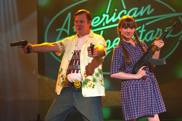 Bobcat Goldthwait’s forthrightly hateful black comedy about America’s media-propelled descent into incivility is like a long, carefully written editorial occasionally interrupted by ludicrous effusions, but Goldthwait is either too angry or too impatient to make the ludicrousness funny. Granted, it’s difficult to make cold-blooded murder humorous in any context. After divorced loser Frank (Joel Murray) is fired for “harassment” and receives a fateful medical diagnosis he contemplates suicide but decides instead to kill a stuck-up teenage reality TV star. The act impresses another teenage girl, Roxy (Tara Lynne Barr), who tags along on what turns out to be a killing spree against the rude and the crude. Victims include a caustic right-wing TV presenter, a bunch of youngsters who talk during a movie screening, a hypocritical Christian evangelist, and a guy who takes up two parking spaces and won’t apologize. Goldthwait’s complaints are specific, as are the things he likes: hot cars, documentaries, fast food, Alice Cooper. In fact, I’m surprised he has it in for Diablo Cody. They share a similar brand of misanthropy. (photo: Darko Entertainment)