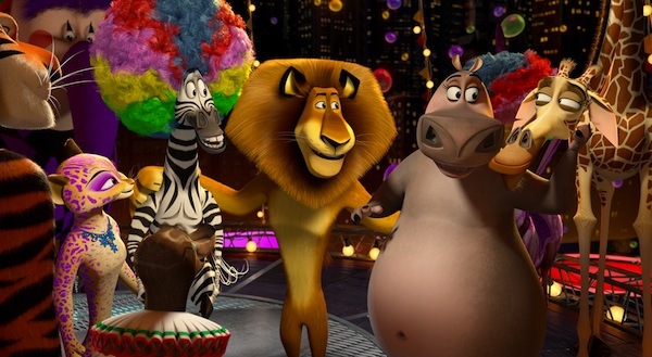 Speaking of anthropomorphizing animals, what’s always bothered me about the exiled characters of DreamWorks’ Madagascar series is their desire to be back in the Central Park Zoo where they were stars. Though I don’t expect animated wildlife to adhere to the instinctual prerogatives of their respective species, I do think writers could at least take it into consideration. After all, lion Alex (Ben Stiller), zebra Marty (Chris Rock), giraffe Melman (David Schwimmer), and hippo Gloria (Jada Pinkett Smith) originally wanted to get back to veldt and then discovered they weren’t cut out for it. Alex even had to fight his urge to chase and kill his food. Their indecisiveness has become the series’ running joke, and at the beginning of the third installment homesickness and the desire to be back in da cage spurs our furry quartet, along with the hangers on that have made the franchise genuinely funny (Sacha Baron Cohen’s lemur, those penguins and those monkeys), to try and find a way back to the Big Apple, which takes them first to Monte Carlo, where the penguins plan to make some money at the roulette tables by dressing one of the monkeys as a high roller. The previous two Madagascars, not to mention most of DreamWorks Animation product, were short on plot and long on gags, many of which fizzled on the screen but due to their sheer volume and the law of averages the movies proved funny on balance. Madagascar 3 simply intensifies this strategy, and while it won’t make you forget Duck Soup it displays the same comic velocity. Quickly pursued by a relentlessly dogged and insufferably French animal control officer named Chantal Dubois (Frances McDormand), the menagerie takes it on the lam and ends up hiding out with a traveling circus that may or may not be going to New York. Though the circus performers, headed by a proud Siberian tiger named Vitaly (Bryan Cranston), at first doubt the bona fides of these pretenders, their imagination and enthusiasm breathes new life into the troupe and its fortunes are revived, even while Dubois is hot on their trail. Along the way, European stereotypes are fried and fricasseed and pop culture canards speared with sloppy aplomb—how many Canadians will get the Cirque du Soleil references? Even when the verbal zingers aren’t zinging, the three directors whip up a visual bouillabaisse so chock full of split second detail that you won’t have to time to process most of it, so the reaction is more visceral than intellectual. But as hard as you may be laughing, inevitably you have to face up to the realization that a circus is even more antithetical to a wild animal’s nature than a zoo, since it has to perform. I’ll just assume that in Madagascar 4, our heroes will long once again for the veldt. It’s their destiny. (photo: DreamWorks Animation LLC)