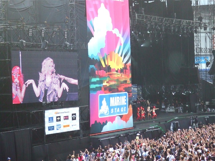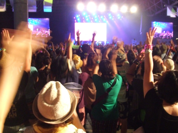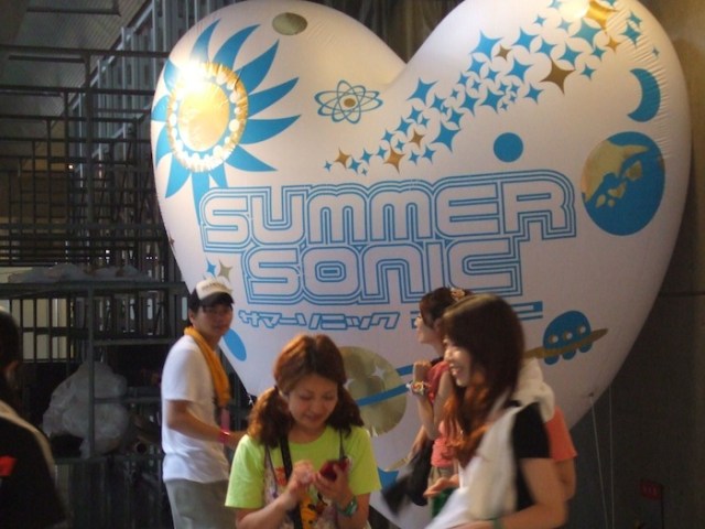 When it started, Summer Sonic was mainly a showcase for foreign hard rock acts, mostly punk and metal, which means it mainly appealed to boys. Over the years, it has also become a venue where vanguard indie artists could get their first exposure in Japan, and to a certain extent it still is, but commercial realities, which have seen foreign acts lose in popularity to homegrown ones, have come to the fore. Big foreign acts are still the main headliners, but parochial tastes are being served more assiduously, and not just tastes for Japanese rock. Perfume, the “veteran” idol J-pop trio, probably attracted more people to the main Marine Stage than any other act this weekend except Sunday night headliner Rihanna. I believe that because I watched the end of the show on the Jumbotron in the convention center, which contains the three secondary stages, and the place was relatively underpopulated at the time. I missed the teen, superhero-costumed female idol group Momoiro Clover Z‘s closing set on the mostly J-music-centered Rainbow Stage Sunday night. It was probably the most hotly desired “ticket” of the weekend, and reliable reports had the room as stuffed and stacked as the Saikyo line during the morning commute. Should we assume these people are all dedicated fans, rubber-neckers, or folks who know what they like and have given themselves over to the familiar pleasures of J-pop, even if they identify themselves as rock aficonados? Pop is no longer just for philistines, but rather than assume that the rock crowd (read: males) was succumbing to more frivolous pursuits, my eyeballs told me the pop crowd (read: females) were opening themselves up to a wider spectrum of experience, and not by hanging on the arms of their Offspring-T-shirt-wearing BFs. They traveled in orange-haired, temp-tattoo-sporting, glitter-makeup-applied packs, giggling everywhere they went, snapping pictures of one another standing in front of anything that might qualify as a landmark, including the artists on stage.