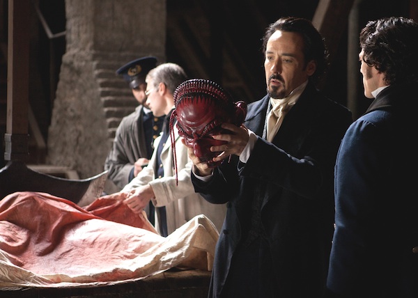One doesn’t want to begrudge director James McTeigue or his scenarists Ben Livingstone and Hannah Shakespeare for trying to reimagine the ill-fated American author Edgar Allen Poe as an action hero, but one would hope they’d display at least half the imagination of their subject. As portrayed by John Cusack, the bard of Baltimore is a stuck-up, self-aggrandizing, alcoholic, opium-addicted loser whose works of horror and mystery are being coopted by a serial killer who uses Poe’s best scenes as models for his grisly murders. Poe’s only saving grace is the love of the beautiful heiress Emily Hamilton (Alice Eve), whose kidnapping ups the ante and forces Poe to actually write a story overnight in order to satisfy the demands of the unknown villain. Eventually, the whole sordid mess is supposed to resolve into Poe being found on a park bench babbling incoherently about evil forces—which is what happened shortly before the author’s death. No one has solved that real-life mystery and this story doesn’t qualify as a reasonable theory. It hardly even qualifies as entertainment. (photo: Amontillado Prod./Poe Producionnes)