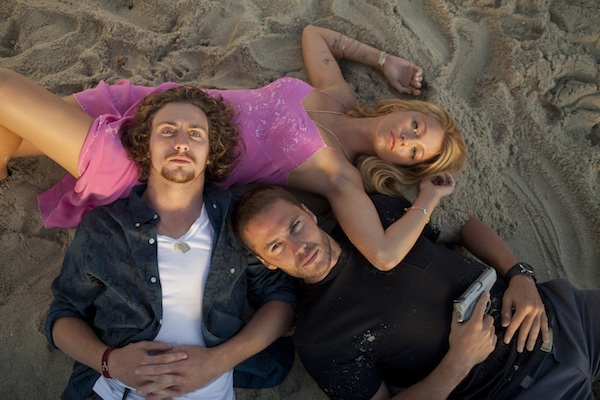 Say this for Oliver Stone: his nostalgia is anything but sentimental. Though his latest “entertainment” is set squarely in the here and now, it betrays a longing for the counter-cultural attitudes of the 60s, especially with regards to marijuana. We’re presented with two producers of a super strain of pot, one a hippie manque with a flair for botany (Aaron Johnson), the other an ex-marine (Taylor Kitsch) with a philosophical bent. Brains and brawn, they share a rich kid dropout (Blake Lively) who loves them equally. When they refuse to make a deal with a Mexican drug lord (Salma Hayek) and her psycho enforcer (Benicio Del Toro), things get hairy, as Robert Stone said in a better, similar story about the heroin trade. John Travolta makes corruption look fun as a sleazy fed who works both sides of the trade, but nothing is meant to be believable, especially with narration by a character who warns you that “just because I’m talking doesn’t mean I’m alive.” Sounds like Sunset Boulevard, nostalgia of an entirely different order…and quality. (photo: Universal Pictures)