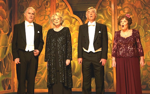 Maggie Smith continues her breathless end-life run of leading roles as Jean, a proud opera diva who gives in to old age and checks herself into a nursing home, which happens to cater to retired musicians. Based on a play by Ronald Harwood that he adapted himself, Quartet askes the audience to take a great deal for granted—not so much that such an institution exists, but that it has to look like heaven on earth. Who wouldn’t want to die on such a gorgeous English estate? For some reason the place is in financial straits, thus precipitating a “gala” where all the illustrious inmates will perform, and three fellow singers (Tom Courtenay, Pauline Collins, Billy Connolly) try to persuade Jean to join them for a performance of the quartet from Rigoletto. She refuses, horrified that her diminished talents would be exposed for everyone to hear. Harwood’s cardboard themes and hackneyed dramatic devices are treated with all sentimental seriousness by first-time director Dustin Hoffman, who gives new meaning to what one of the characters refers to as “dignified senility.”(photo: Headline Pictures [Quartet] Ltd. and the BBC)