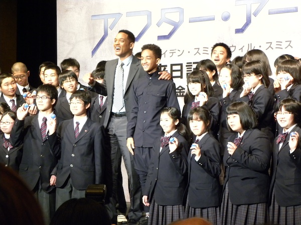 When one boy asked in English which scene was the “hardest” and which scene was the “happiest,” the Smiths concurred on the former, which was one of the scenes in the footage shown earlier, an argument between their two characters that ended with a typical bit of adolescent defiance. “As much as it’s acting you have to be careful about carrying the negative emotions,” Will said, belaboring the point. “After that scene, you get to the end of the day and as a parent get an overwhelming urge to put your costar on punishment.” However, the second part of the question flew over their heads until the emcee clarified that what they boy meant was which scene was the most “enjoyable” to do. Again they both agreed at the expense of the movie. The press was asked not to reveal too much of the plot, but for some reason nobody bothered to tell the Smiths that. “We were almost never together,” Jaden said. “And anyway there weren’t too many happy scenes, until the very end.”