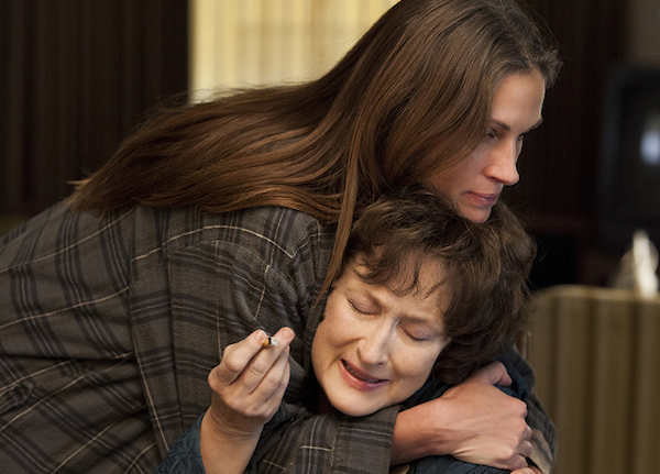 Tracy Letts adapts his own Pulitzer Prize-winning play for a movie directed rather uninspiringly by John Wells. Meryl Streep is completely within her element as Violet Weston, the matriarch of an Oklahoma family that comes together to mourn her husband, the respected poet and all-around wonderful human being Beverly Weston (Sam Shepard), after he drowns himself. Though Beverly was a famous alcoholic the reasons for his self-annihilation are never explored, and in a curious opening scene meant to establish his relationship with the violently volatile Violet, he is interviewing a young Native American woman, Johnna (Misty Upham), to be Violet’s caretaker since she is suffering from mouth cancer. However, Violet’s bigger problem, especially for Beverly, is her pill habit, which apparently predated the cancer onslaught. She self-medicates to beat the band, and after Beverly’s death assembles children and siblings at her big home on the prairie and basically rages at them. What’s immediately suspicious about Letts’ intentions is that there is no one in this motley group who doesn’t have a shameful secret or disastrous character flaw. Most possess both. Violet’s three daughters are such calculated constructs that when they are inevitably put in the same room for a wine-fueled discussion you can practically predict what each one says. Ivy (Juliane Nicholson) is the most normal, the daughter who didn’t move away and who channeled her resentment into a love affair with her first cousin, who goes by the uncomfortable sobriquet of Little Charles (Benedict Cumberbatch) in order to distinguish him from his father (Chris Cooper), who is married to Violet’s salty sister Mattie Fae (Margo Martindale). Karen (Juliette Lewis) is the batty free spirit engaged to the thrice-divorced entrepreneur (Dermot Mulroney). But the focus of the movie, when it veers away from Violet, is eldest daughter Barbara (Julia Roberts), who matches her mother curse-for-curse and thought she was rid of the old bat when she left home years ago. Violet’s sense of betrayal is acute and Streep practically tattoos it on her forehead, but there’s no denying that her bellowing insults are pretty entertaining. They might even be shocking if the revelations weren’t bungled so badly by Wells, who prefers to let Letts’ script speak for itself. If the direction were sharper the movie might not feel so dragged out (though it’s 90 minutes shorter than the play). And while the actors for the most part give as good as they get from Streep, no one will mistake them for a real family, what with Brits like Ewan McGregor and Cumberbatch pretending to be Midwesterners and looking pained in the process. (photo: August OC Films Inc.)