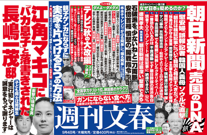 Here’s this week’s Media Mix about the media’s reaction to Asahi Shimbun’s retraction of its comfort women reporting in the 1980s and 90s. Though I point out how right-leaning publications have used the retraction to their own advantage and offer some balancing commentary from left-leaning publications, the main point is that the “pile-on,” as my editor so colorfully put it in the header, may have more to do with economics and competition than it does with ideology. But ideology shouldn’t be discounted. One aspect I didn’t explore fully is the gradual drift over the years away from the center, though some commentators think there was never any drift; that Asahi has always been a staunchly left-of-center newspaper and Sankei a much farther right-of-center one. The point is that overt political positions are now seen as a means of cultivating a broader base for the more conservative media with the re-ascendance of the LDP in the past few years. In Masaru Sato’s Flash article, which I reference in the column, he says that newspaper reporters “unconsciously” write articles that fit their respective bosses’ stance in order to gain approval, regardless of their own predelictions. This isn’t to say they are lying or misleading readers, only that they will likely lean right or left in accordance with their employer’s position. This isn’t always true. The Asahi’s reporting on the collective self-defense issue could be seen as contradicting the paper’s editorial position, which is suspicious of the Abe constitutional end run; while the nominally right-wing Yomiuri and Nikkei have come out strictly against politicians visiting Yasukuni Shrine, mainly for pragmatic reasons. What Sato wants to say is that when a publication sees an opening, such as the one offered by the Asahi with its retraction, rivals will rush through it recklessly because of the sensationalist points they can score. It’s been well documented that publications that consistently run negative articles about South Korea seem to sell well, which is why so many print such articles. Does that mean the general public is reactionary by nature? Not necessarily, but it seems to be a universal truth that right-leaning forces tend to be louder in the media in pursuit of their ends than left-leaning forces are. Sensationalism is its own reward.