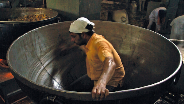 Valerie Berteau’s hour-long documentary looks at the Golden Temple in Armritsar, India, which prepares 100,000 free meals every day. Anyone can partake, from the poor to the rich, from locals to tourists, but there is one condition: those who eat must also lend a hand, whether it be cooking, setting tables, or washing the utensils, which are impressive in their size and functionality. This Sikh custom has been in place for 600 years and is based on the ideal that sees charity as the “nexus of culture, nature, and human necessity,” according to the explanatory titles. (There is no narration) Though the viewer may want more revealing explanations—maybe an interview or two with people closely involved with this massive, daily endeavor—Berteau effectively conveys its scale with sweeping shots of people standing in line, washing, and sitting down to eat. The process of preparation is almost overwhelming in its simplicity, a theme that doesn’t need explanation and which seems second nature to the people who both participate and run the operation. It’s a huge organism that thrums with vigor.