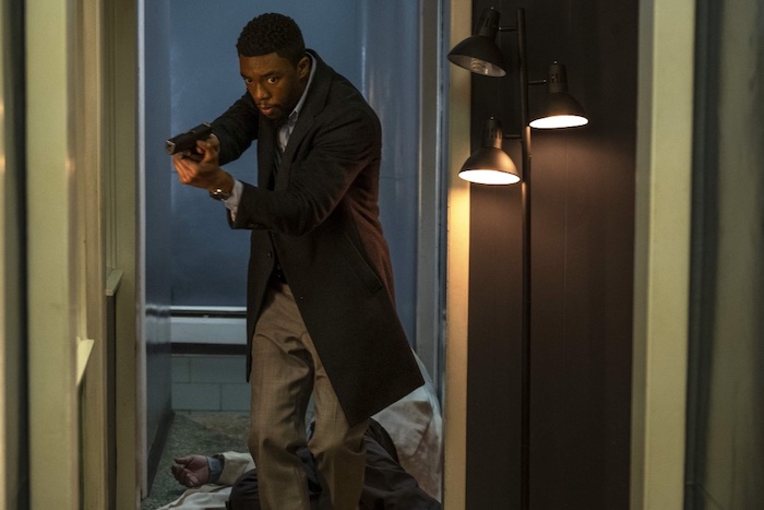 Thus the opening scene comes off as an inadvertent blast of cognitive dissonance. A child sits in church at the funeral of his policeman father, who was killed by drug addicts, probably during that period in the 80s when crack swept the city and destroyed a lot of black families. The fact that the child and his father are black is enough of a head-scratcher in terms of launching a plot, but the minister’s sermon, which celebrates the fact that the policeman killed two of his attackers before he himself was killed, is chilling in its implications. And then the child grows up to be Andre Davis (Boseman), a detective with a reputation for shooting first and asking questions later.
