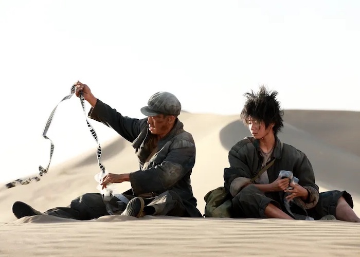 The movie is also about movies in the most elemental way. An escapee from a farm prison, Zhang (Zhang Li), crosses the desert on foot to watch a movie in a backwater town. When he arrives, however, he learns that he is too late. The screening, which is carried out by a local workers unit, has already concluded, the film reels packed up and ready to go to the next town. While trying to learn more, Zhang notices an unkempt waif, Liu (Liu Haocun), steal one of the film cans from the delivery motorcycle and pursues her. What ensues for the next half hour is an almost slapstick level cat-and-mouse game, as the film cannister changes hands between Zhang and Liu as they make their way to the next town, where, as it happens, Liu lives in abject destitution with her younger brother.