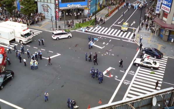 This subject is endlessly fascinating to the Japanese media, and anti-capital punishment advocates have pointed to the use of random murder as a means of asserting one’s existence as proof that the death penalty is not a deterrence, as its proponents claim, but rather an incentive to kill. It’s unlikely that such an argument will sway the Japanese public, which, in surveys, overwhelmingly supports capital punishment, though mainly for the reason that perpetrators of such acts must pay for them with their lives, meaning the punishment is meant to be retributive rather than deterrent. Kato’s case is thus more instructive of what some killers want to accomplish, because his motives have been studied and discussed more. As recently as May 19, in fact, Mainichi Shimbun ran a long article about Kato and his crime, almost two months before Abe’s murder. There is no evidence in the article that its timing had any significance. It just seems to be yet another attempt to make sense out of what he did, and points up how historically important the rampage was. The first effect of the killing was a revision of the Firearms and Sword Control Law, which has since made it legally more difficult to carry a knife. Just after noon on June 8, 2008, Kato drove a rented two-ton truck into a crowd of pedestrians in an intersection that was closed off to traffic, as it usually was on Sundays in the shopping district of Akihabara, killing and maiming some people instantly, and then he emerged from the truck with a weapons-grade knife he had recently purchased at a military supply store and started stabbing people at random.