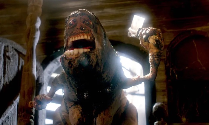 The narrative lines are as complicated and intricate as the mise-en-scene, which means that Mad God is often impossible to follow, and best appreciated as a cornucopia of dystopian images. The protagonist is referred to in the credits as the Last Man (voiced by Alex Cox, though much of the dialogue is incoherent), a character dressed in steam-punk couture who descends into a wet, rust-encrusted netherworld filled with industrial detritus and dismembered dolls. Consulting a map at every turn, the Last Man appears to be on some kind of deadly mission, and the movie’s plot takes on the trappings of an odyssey, with each new location providing a distinct episode of danger and lunacy. The dystopian ideas are expressed in scenes showing slave-like minions made of straw performing various kinds of labor, some industrial, some military in nature, while being tormented and often killed by bizarre creatures that seem to be carrying out the wishes of a cadre of overlords depicted in background stock footage shown on monitors (this footage contains the only images of actual human beings). Among the ruins there are also doctors experimenting on humanoid forms in the goriest manner and scientists testing terrifying weapons. Female sexual subjugation is rampant and obvious.