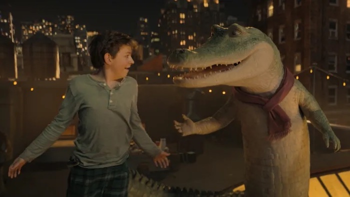 The cast is certainly game. Javier Bardem is creepily chipper as the anachronistic stage performer and impresario, Hector Valenti, who, down on his luck after his sleight-of-hand shtick is rejected, happens upon Lyle warbling in the back of an exotic animals shop in Manhattan. He purchases the lizard and raises him to sing popular songs in the hopes that he can make a fortune, but when he gets his chance, Lyle chokes from stage fright and Hector is forced to go on the road to make money, leaving Lyle alone in his attic apartment. Though the idea of abandoning what is now a full-grown crocodile in a New York City apartment alone for months at a time challenges whatever capacity you have to suspend disbelief for the sake of entertainment, the bewilderment is compounded by any knowledge you may possess of just how high rents are on W. 88th Street these days, and, yes, the movie is clear in its assertion that it takes place in the late 2010s. Bewilderment then reaches meltdown proportions when a math teacher (Scott McNairy) moves into the same apartment building with his family. Fortunately, his wife (Constance Wu) writes cookbooks for a living that must make a ton of money, because there is no way a public school teacher can afford such beautiful digs on the upper west side. Nevertheless, the couple’s misfit son, Josh (Winslow Fegley), accidentally discovers Lyle upstairs and an inter-species, but mostly one-sided, friendship ensues.