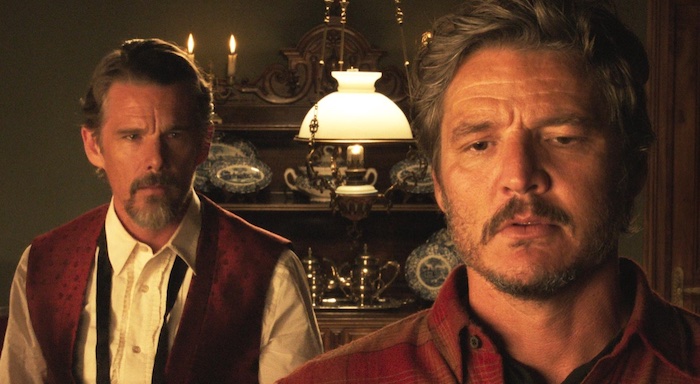 The coming-to-terms in Pedro Almodóvar’s 31-minute English-language western, Strange Way of Life, happens much later in the central characters’ lives, and involves both sex and violence, in that order. Pedro Pascal and Ethan Hawke play two former ranch hands who reunite many years later to consummate, probably not for the first time, the love they felt for each other when they were young bucks. The difference now is that Jake (Hawke) is the sheriff of an unnamed town and Silva (Pascal) is the father of a fugitive wanted for murdering Jake’s widowed sister-in-law, so the tumble in the hay immediately takes on the cast of an ulterior motive, at least on Silva’s part. But as in all things Almodóvar, it’s never that simple.