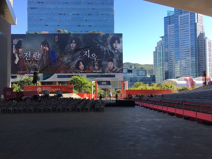 One immediate observation after one full day at the festival: Chanel and Netflix seem to have taken over. As I mentioned yesterday, Chanel, in addition to sponsoring the Asian Film Academy, now gives out an award to a vital female Asian filmmaker. They also provide a commercial that runs before every screening with Brad Pitt and Penelope Cruz supposedly recreating a scene from Claude Lelouch’s A Man and a Woman. At one point, Pitt whispers to Cruz that he thinks they’ve somehow “annoyed” the wait staff at the restaurant where they’ve ordered steaks, of all things. After the second go-round, I was already annoyed by the spot and dread the fact that I will have to sit through them countless times for the rest of the festival. It’s enough to drive one to the video library. As for Netflix, the opening film was the premiere of production that will probably be available on the streaming service in a few weeks and there are billboards all around the Cinema Center and the Haeundae resort area advertising the movie, Uprising, and Season 2 of Hellbound, which is also being shown at the festival.